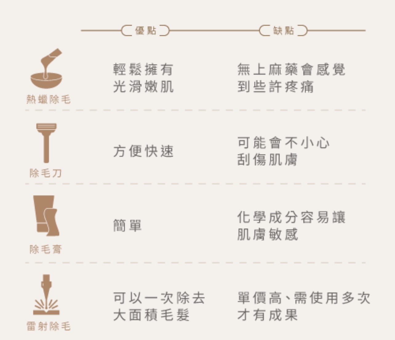 使用刮刀容易刮傷,熱蠟時間需找男仕淨毛美容師、雷射費用太高不夠經濟實惠,